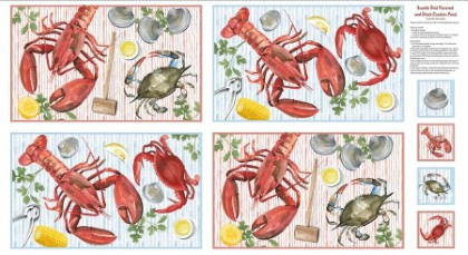 Seaside Boil will transport you to summertime when you will be dipping lobster claws in melted butter. Tasty crustaceans of crabs and lobsters make fun decorations for your patio furniture. Create chair cushions with the crabby stripe or subtle oyster print. Easily top your table with the placemat panel that includes drink coasters as well. Make a table runner to go with using the lobster and butter plaid for the perfect table setting. Get cracking on your next project with Seaside Boil.