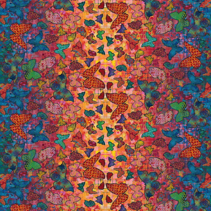 Introducing Wings of Wonder, my latest fabric line that I created to celebrate the magical beauty and inspiring transformation of butterflies. There is something truly heartwarming about these delicate creatures — their journey from humble caterpillars to graceful butterflies reminds us of God’s infinite creativity. The centerpiece of this collection is a 1-yard panel featuring a vibrant rainbow background filled with intricate patterns and lacy medallions. Butterflies gently swirl across the fabric, starting with large, bold butterflies at the bottom and gradually transforming into smaller, whimsical butterflies at the top. This design captures the graceful movement and serene beauty of butterflies. To complement the panel, I designed a variety of playful and colorful coordinating patterns. Tapestry features flowers and butterflies dancing on a rich blue-green background. Glow and Pebbles offer two cheerful dot patterns — Glow in a vivid pink and Pebbles in a bright rainbow of colors. Lacy showcases elegant medallions on a warm, rich ground of red, orange, and pink, while Fiesta bursts with vibrant, multi-colored starbursts. Wings presents smaller butterflies fluttering across a scaled-down version of the panel’s intricate background. Circle Pop adds a modern, lively touch with bold, popping paper circles on a dramatic black background. As always, I’m excited and grateful to see the wonderful creations you make with this collection. Whether you’re crafting quilts, accessories, or garments, Wings of Wonder is designed to spark joy, creativity, and a sense of wonder. Let your imagination take flight!