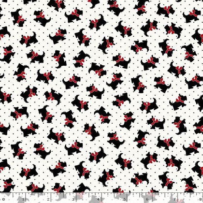 Aunt Grace Goes Bold by Judie Rothermel for Marcus Fabrics features 1930's scottie dogs, dots, flowers, children, cats, cherries, pin dots, pin stripes, and flower pots in bold primary shades of yellow, blue, navy, red, white, cream, and green.