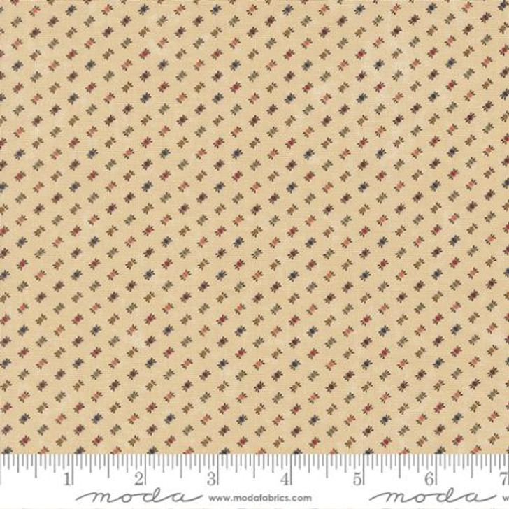 Wheatland by Kansas Troubles Quilters for Moda Fabrics evokes the serene beauty of the Midwest during the golden days of summer. This fabric features a lovely floral design with dark blue, yellow, and red flowers set against a warm tan background. Add this to your next quilting project for a touch of rustic charm!