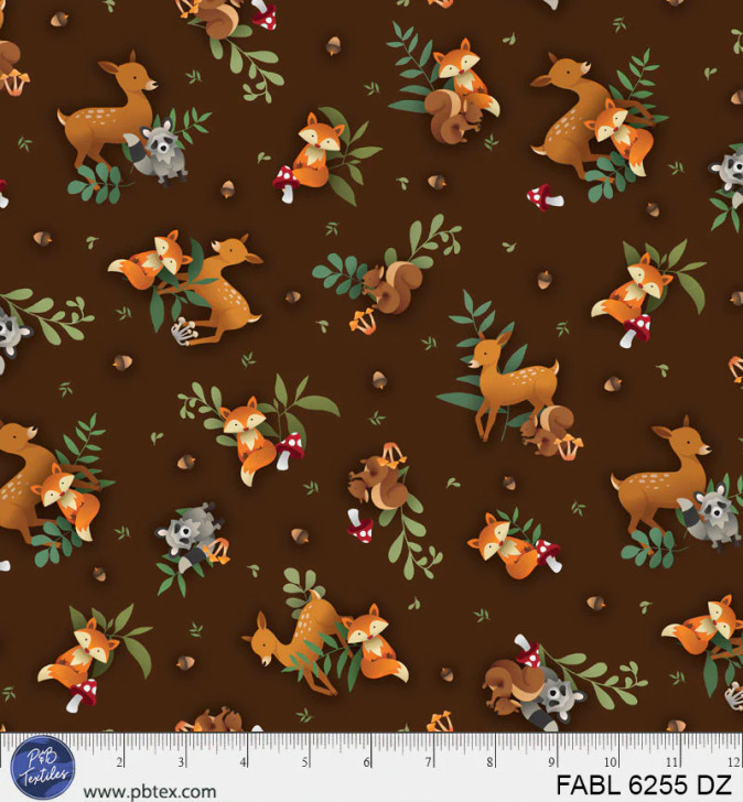 P & B Textiles - Fablewood - Tossed Creatures, Dark Brown