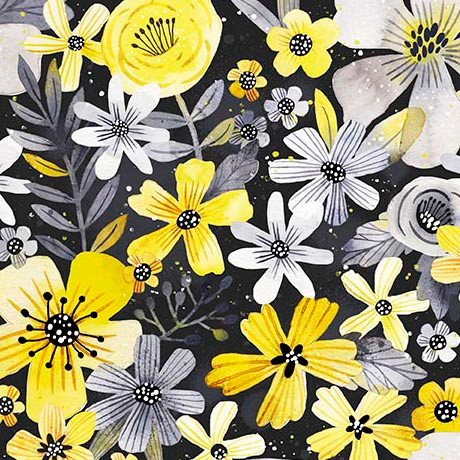 Gorgeous florals in a bold palette of tonal grays, sun-washed yellows, crisp white, and deep black are center stage in this strikingly stylish, and endlessly versatile collection. This collection checks all the boxes for the maker looking for unique home décor, fashion-forward apparel, or on trend quilts. ©Cynthia Frenette.