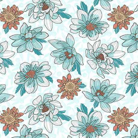 Dahlias are nothing short of dazzling in this contemporary and stylish collection. Bouquets of stylized florals in rich teals infused with salmon pink pair with delicate flora, tonal, checks and stripes. Create one-of-a-kind quilts, fashionable home décor, accessories, and apparel. Project possibilities are endless! ©Julie Lynch