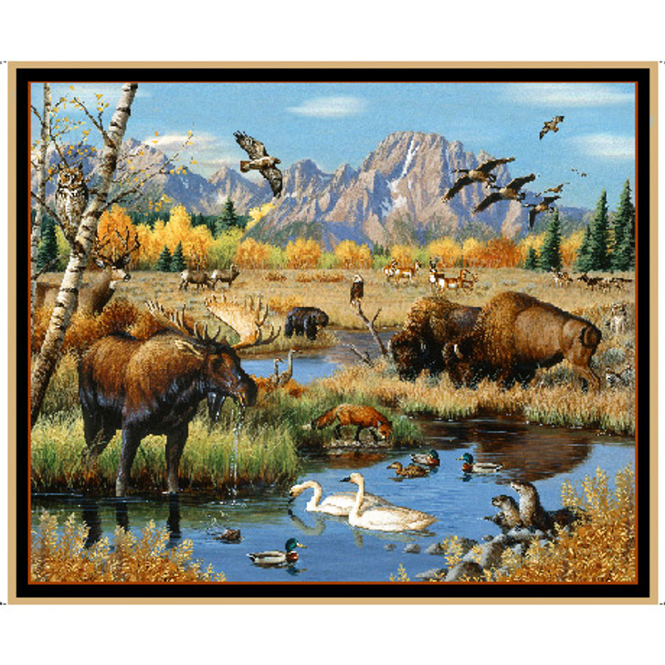 Wildlife artist Cynthie Fisher sets the stage with a 36" panel showing a mix of animals meandering in the plains against a stunning backdrop.