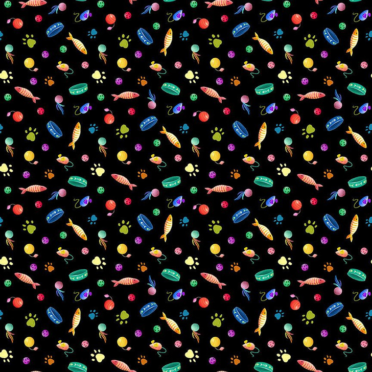 Dive into a world of whimsical fun with this enchanting fabric featuring a playful array of colorful cat toys and paw prints scattered across a sleek black background. Vibrant motifs like bouncy balls, whimsical fish, and adorable mice in shades of red, blue, green, yellow, and purple bring a lively, pet-inspired charm that's perfect for cat lovers and creative projects alike. The bold contrast of the dark base against the bright, multicolored designs creates a striking visual appeal, making it ideal for quilting, home décor accents, or custom pet accessories. Crafted from soft, breathable material, this fabric offers versatility for sewing enthusiasts, whether you're whipping up cozy blankets, fun tote bags, or upholstery pieces that add a touch of feline flair to any space. Its durable weave ensures it holds up to everyday use while inspiring endless imaginative possibilities.